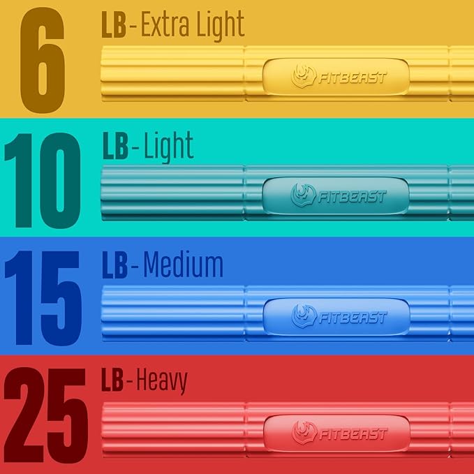 - 𝟰-𝗟𝗲𝘃𝗲𝗹 𝗥𝗲𝘀𝗶𝘀𝘁𝗮𝗻𝗰𝗲 𝗦𝗲𝘁 𝗳𝗼𝗿 𝗣𝗿𝗼𝗴𝗿𝗲𝘀𝘀𝗶𝘃𝗲 𝗧𝗿𝗮𝗶𝗻𝗶𝗻𝗴: Elevate your workout with the wrist exerciser bars set, featuring four color-coded resistance levels, ranging from 6 to 25 lbs. Tailor your exercise routine with: Yellow (6LB, Extra Light), Green (10LB, Light), Blue (15LB, Medium), and Red (25LB, Heavy), allowing for a progressive increase in strength. Ideal for physical therapy and arm muscle development, start with the level that suits you and advance at your own pace.