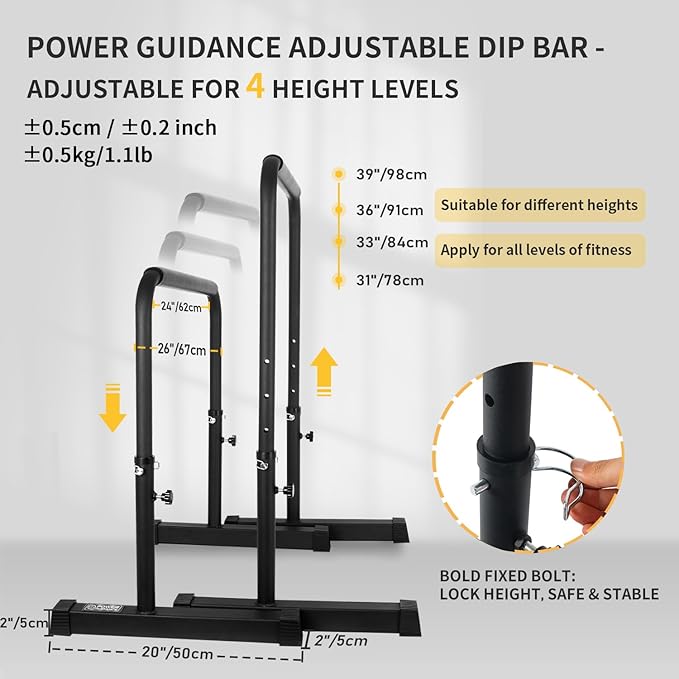 - Portable & Easy to Store: The POWER GUIDANCE dip bar is easy to deconstruct, portabable, compressed and Folded. If you are a fitness enthusiast who wants equipment that you can take with you anywhere, this dip bar is your ideal choice
